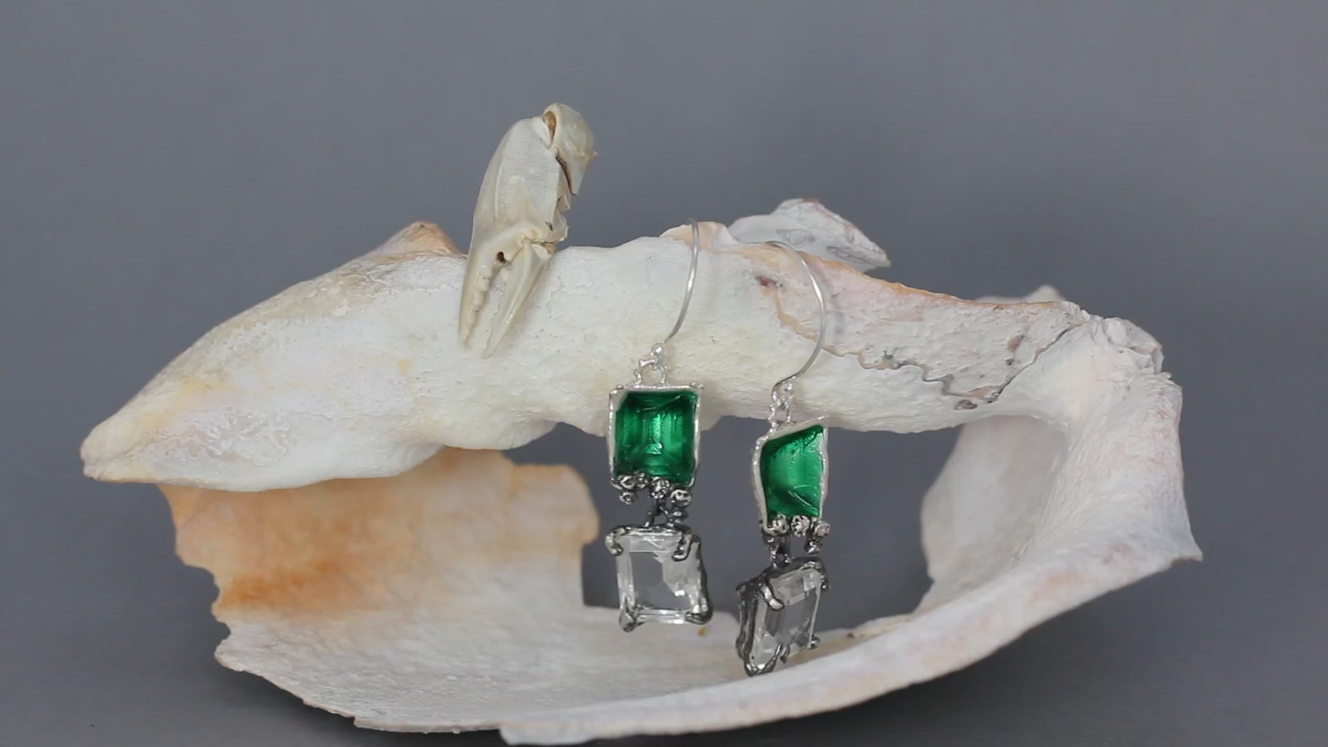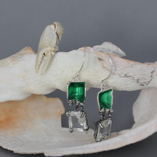 These handmade earrings will have you looking twice to make sure they are not real precious emerald gemstones... For those looking for a sustainable an ethical option to mined precious gemstones. The bottom section including a crab claw holds a large shimmering quartz gemstone.