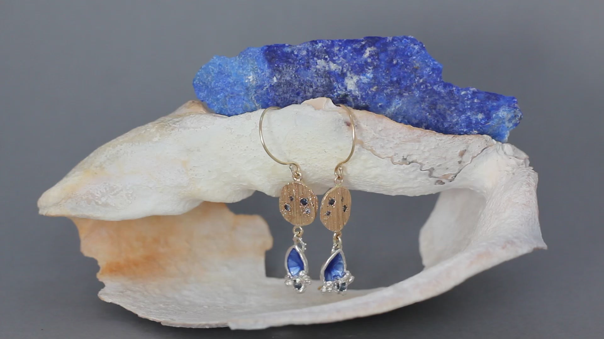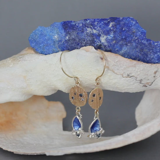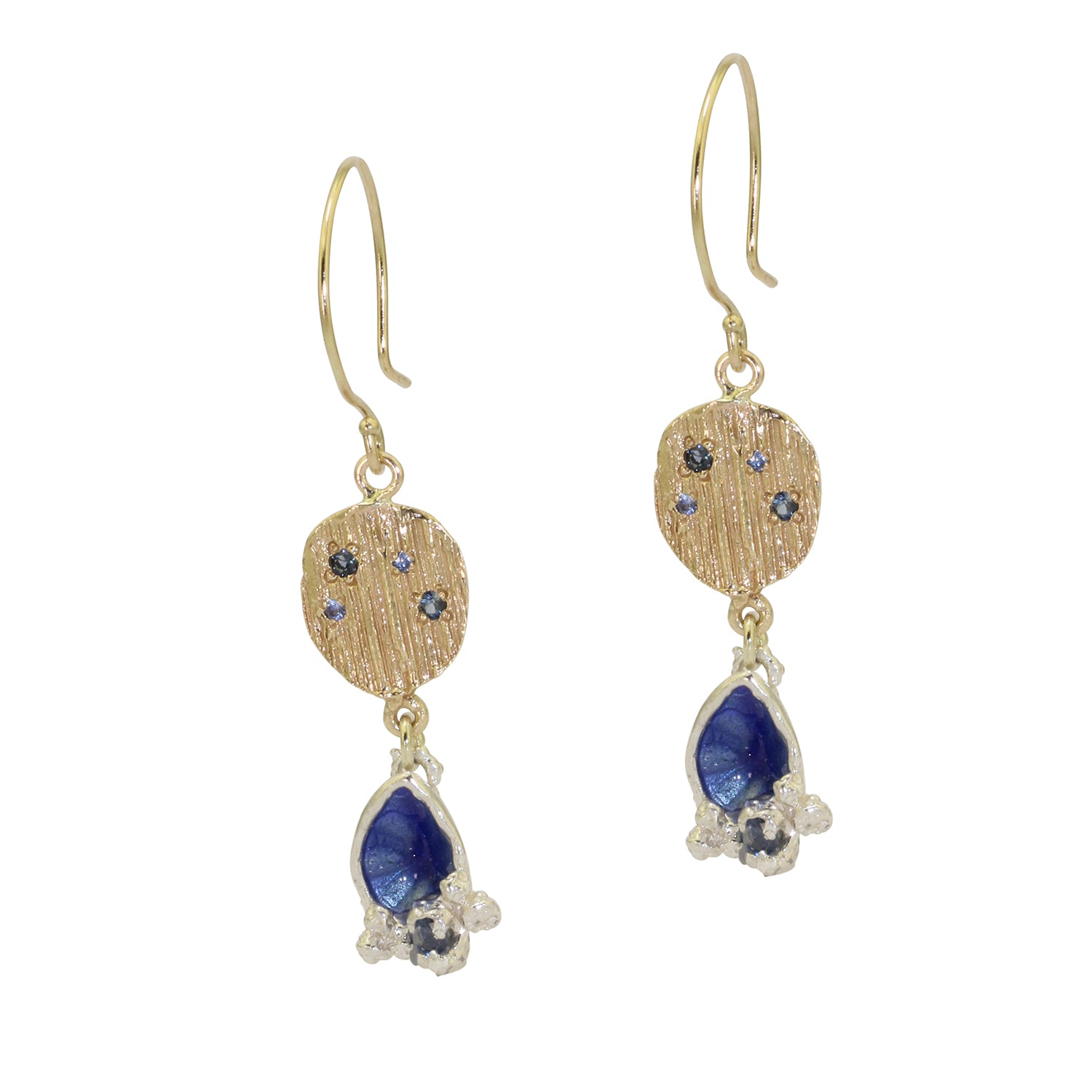 These sapphire waves earrings have lots of texture of details in them. The royal blue enamelled bottom section will trick your eye into thinking it's a very large sapphire gemstone!