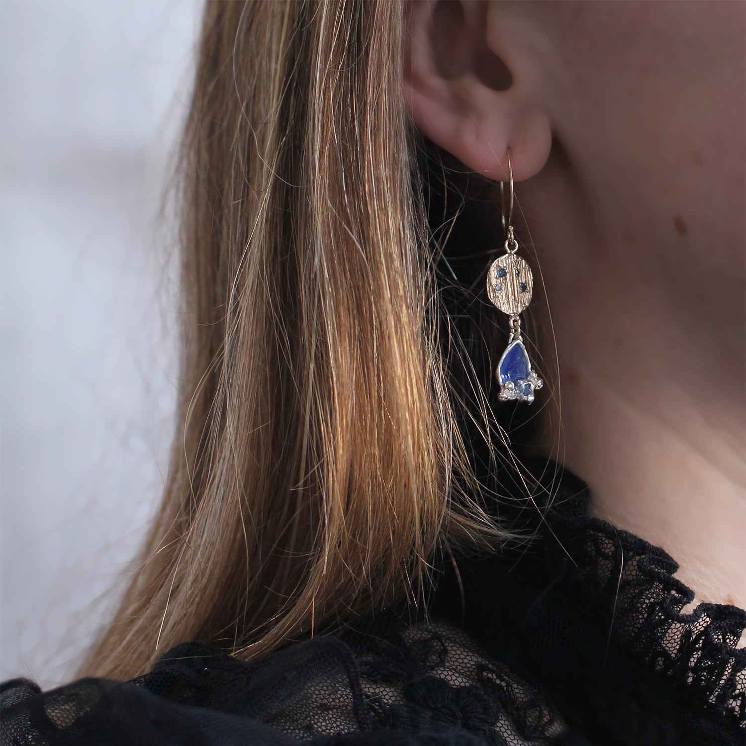 The top is a bark textured 9 carat yellow gold part with 8 blue sapphires set like waves. The bottom is royal blue pear shape and holds a sapphire gemstone.